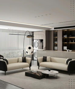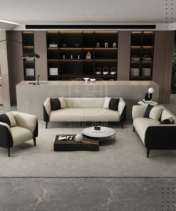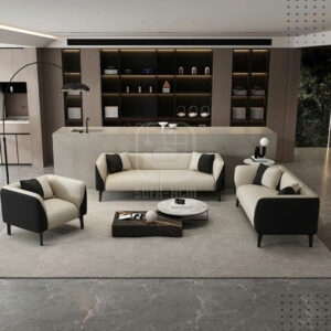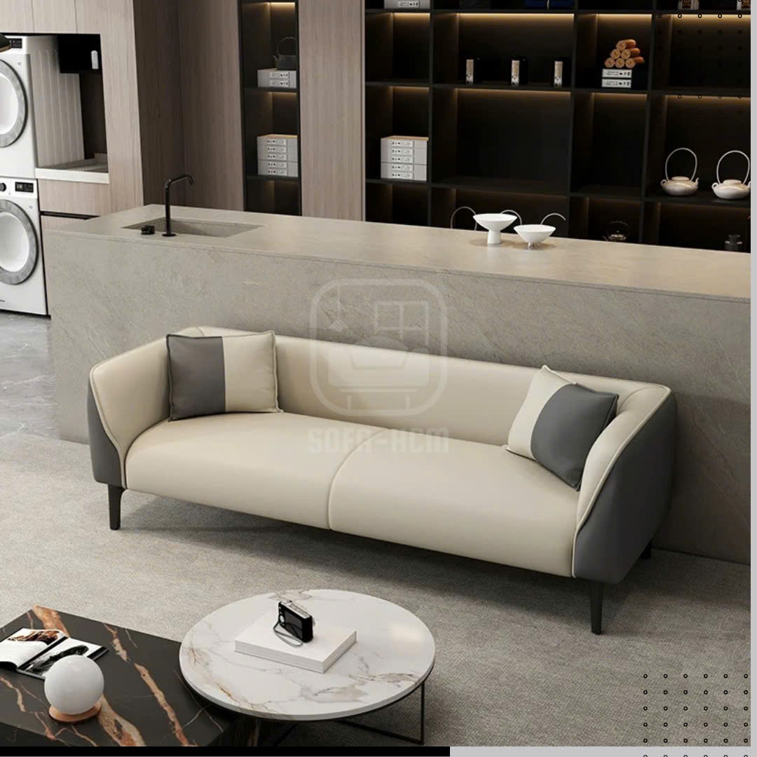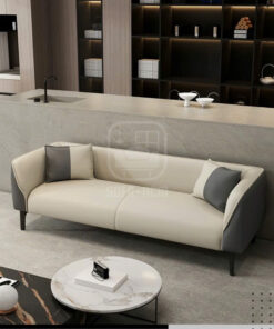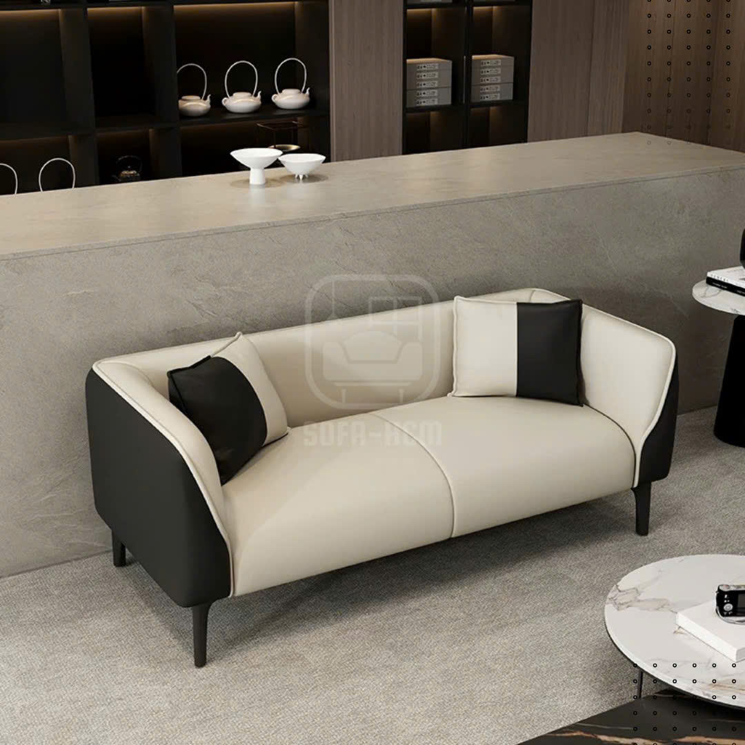 Mẫu sofa băng da cao cấp sở hữu thiết kế tối giản nhưng đầy tinh tế, nổi bật với sự kết hợp màu sắc trắng kem – đen tương phản sang trọng. Kiểu dáng bo cong mềm mại giúp tổng thể ghế trở nên thanh thoát, hiện đại và dễ dàng hòa hợp với nhiều phong cách nội thất khác nhau.